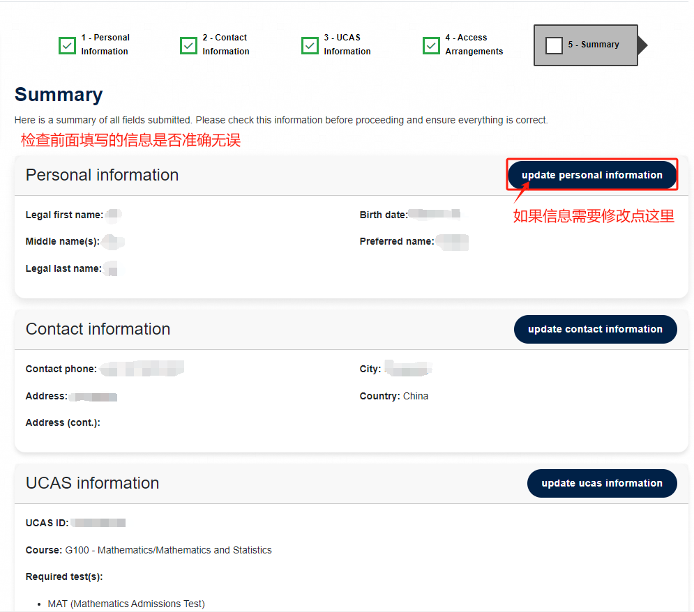 这个页面可以检查你前面填写过的内容,如果需要修改,点击右边对应深蓝色方框的【update information】进行更新。