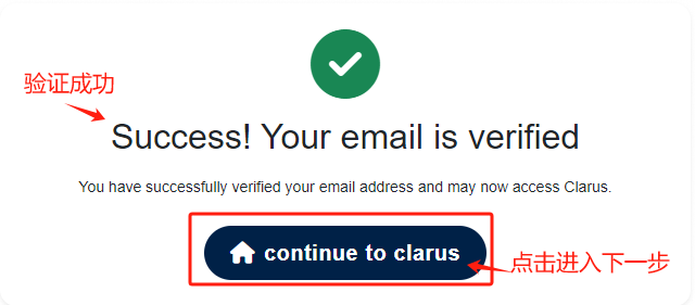 出现Success就表示验证成功了,点击【continue to clarus】后,会跳到登录界面。