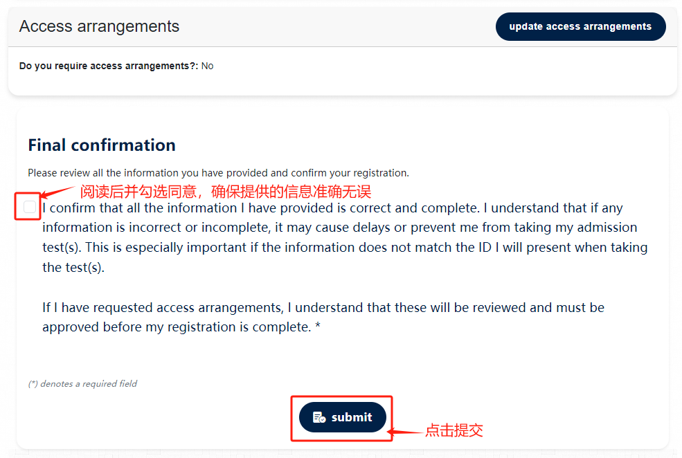 检查无误后,阅读注意事项并勾选同意,最后点击【submit】提交。