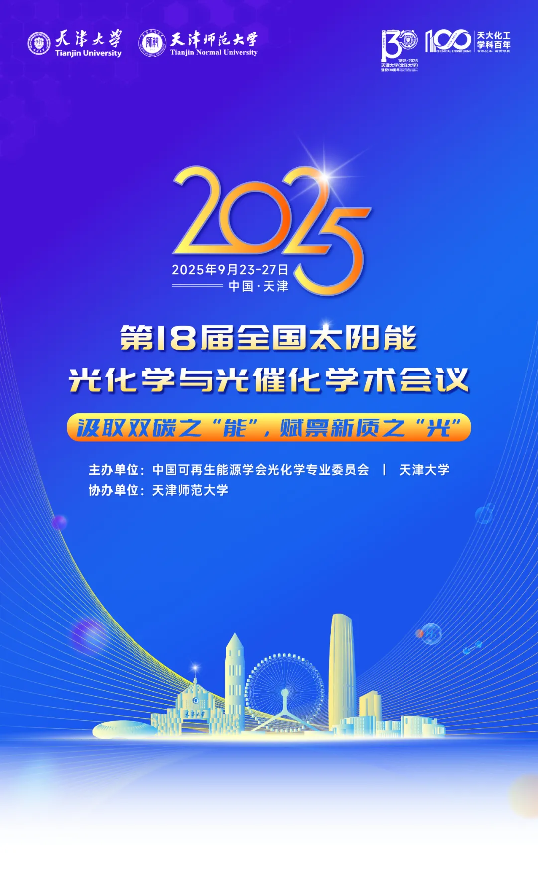 为深入贯彻落实党的二十大精神,践行绿色低碳发展理念,培育发展新质生产力,全面响应国家“加快实现高水平科技自立自强”的战略部署,充分发挥太阳能技术对“双碳战略”的支撑作用,中国可再生能源学会光化学专业委员会定于2025年9月23日至27日在天津市召开“第十八届全国太阳能光化学与光催化学术会议”。本届大会由中国可再生能源学会光化学专业委员会和天津大学联合主办,天津师范大学协办,由叶金花教授与巩金龙教授共同担任大会主席。大会将围绕太阳能光化学与光催化领域的核心议题,促进学术交流与合作,共同应对全球能源与环境挑战。