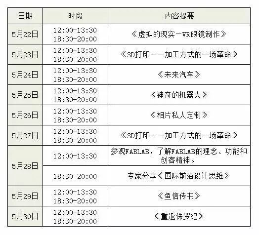 5月22日-5月30日,FABLAB创新实验室每天都将开展科普互动小游戏,参与体验后可获得盖章,集齐一定数量的印章后,可兑换相应的小礼品。同时FABLAB实验室还将开展创客工作坊体验活动,免费向6岁及以上青少年及成人开放。