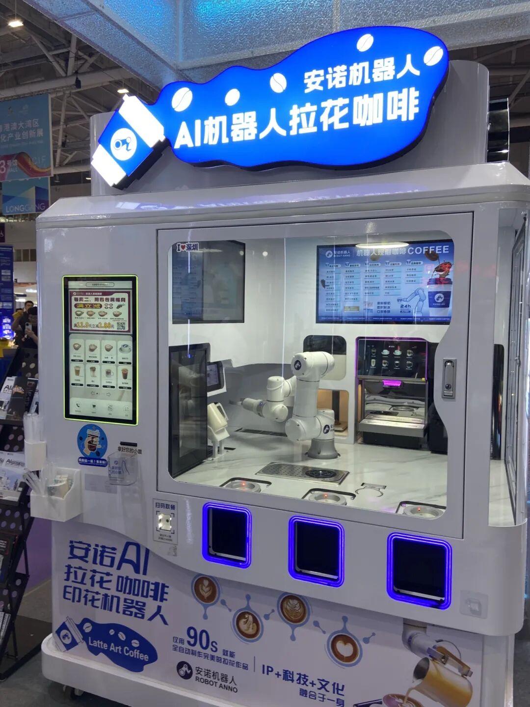 不仅如此,人们在宝安馆还可以看到拉花咖啡机器人“炫技”。来自安诺的AI智能机器人拉花咖啡机仅用90秒就能全自动制作拉花作品。其采用单臂拉花技术,不仅可以制作冰热等多种口味咖啡,还可以一键上传图片打印拉花图案。