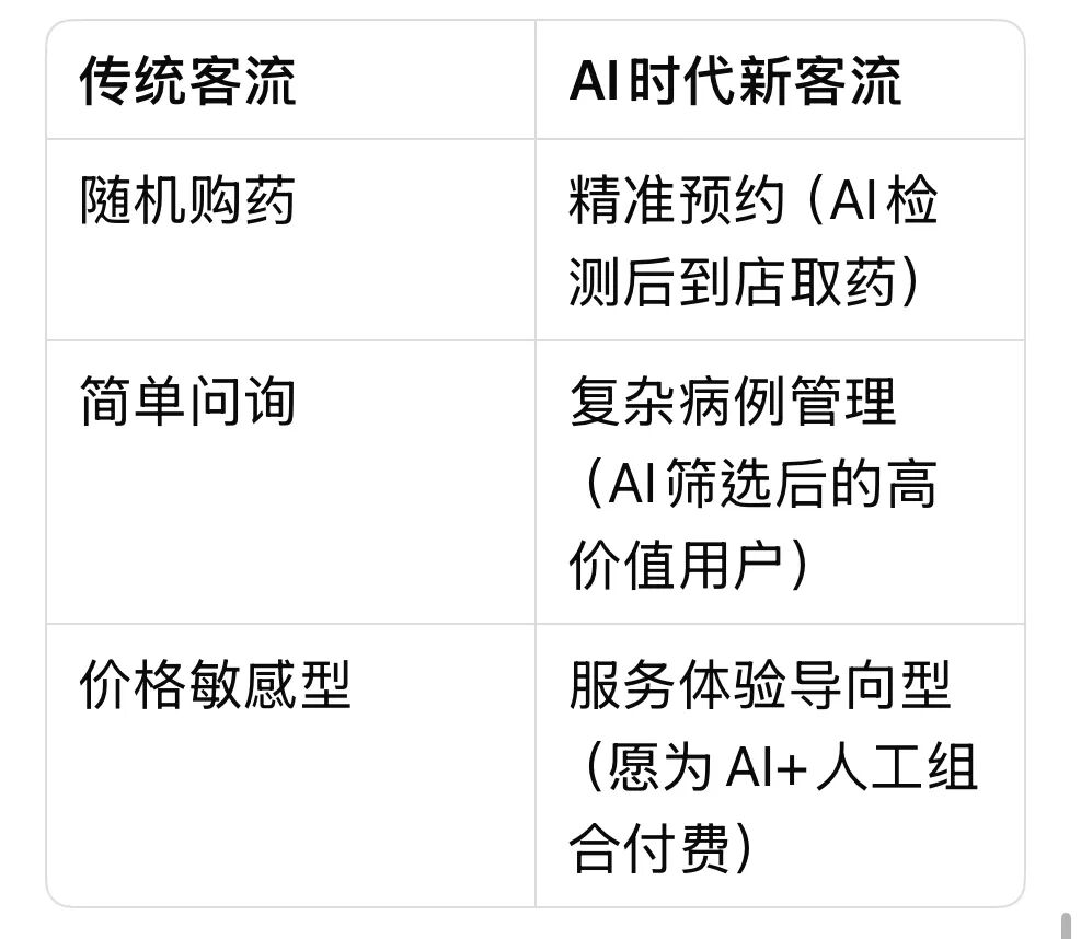 DeepSeek认为,AI引发的客流下滑本质是低价值流量的筛选过程,药店需主动拥抱“降频提效”趋势,用AI过滤无效客流,聚焦服务愿为专业与情感支付溢价的核心用户。唯有将AI转化为“服务放大器”而非“替代者”,才能在这场健康消费升级中重获生机。