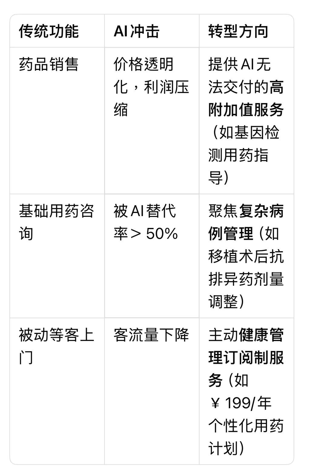 总体而言,AI不会瓦解药店的专业壁垒,但会重塑壁垒的构成要素。过去零售药店通过信息垄断、地理覆盖、基础咨询构筑起来的壁垒逐渐被瓦解,而复杂病例处理能力、人机协作效率、健康数据资产将帮助药店构筑新“专业”护城河——对消费者,用AI提供“更便宜、更快捷”的基础服务;对自身,用AI实现“更精准、更高端”的价值升级。