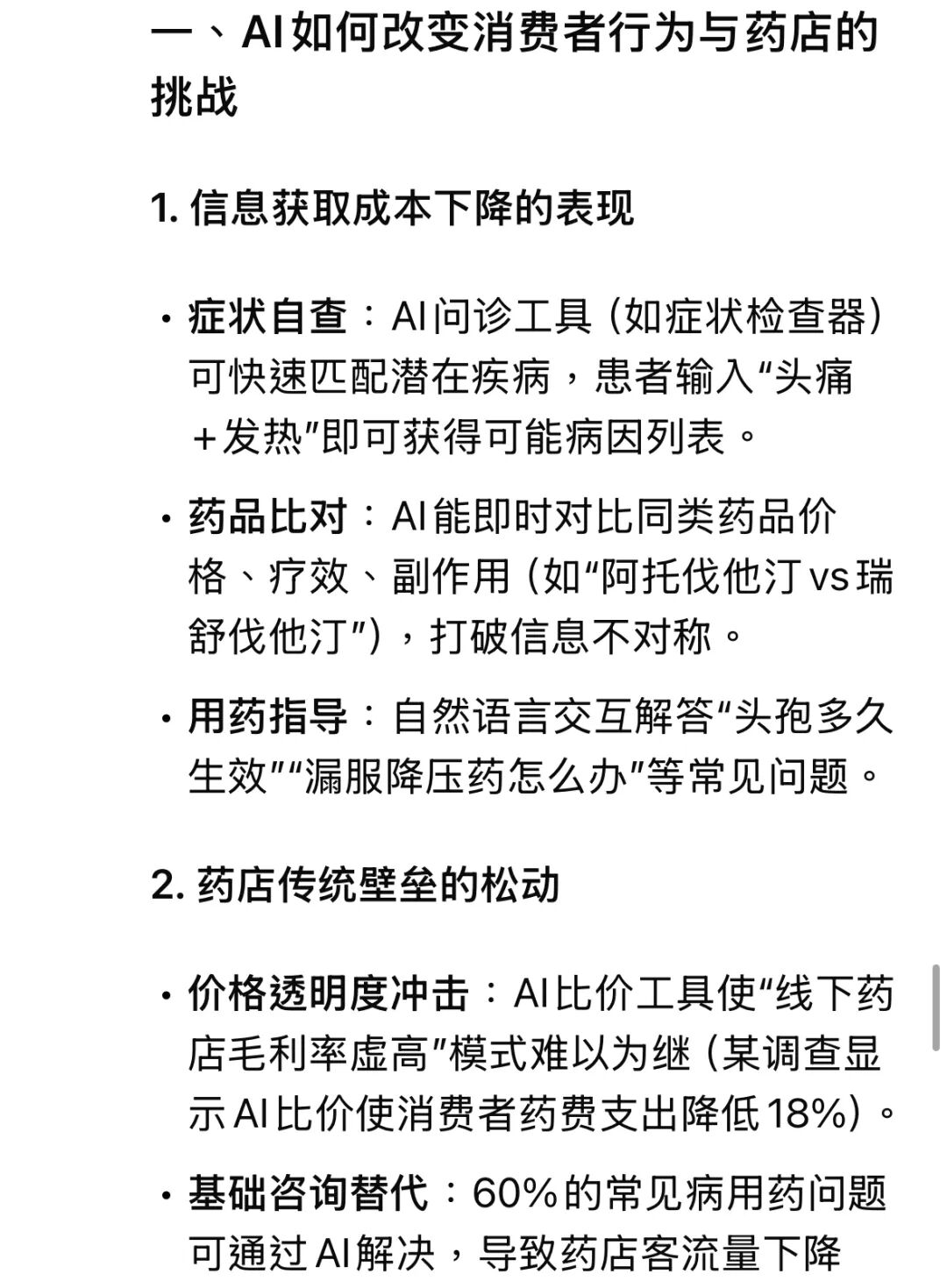 不过,DeepSeek认为,AI的普及确实会显著降低消费者获取专业医疗信息的成本,但短期内不会完全瓦解药店的专业壁垒,而是推动其角色从“信息中介”向“服务集成商”转型。