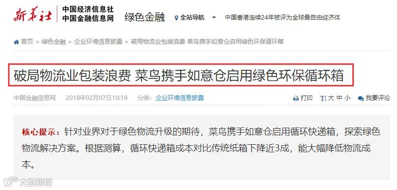 面对人们对于物流业绿色升级的期望,菜鸟携手如意仓启用循环快递箱,力求探索出绿色物流解决方案。