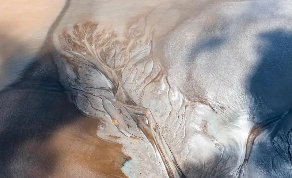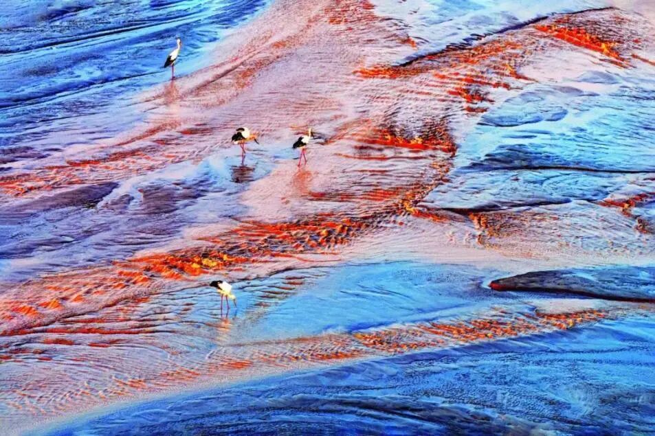 滩涂如斑斓调色盘,河流似飘逸丝带