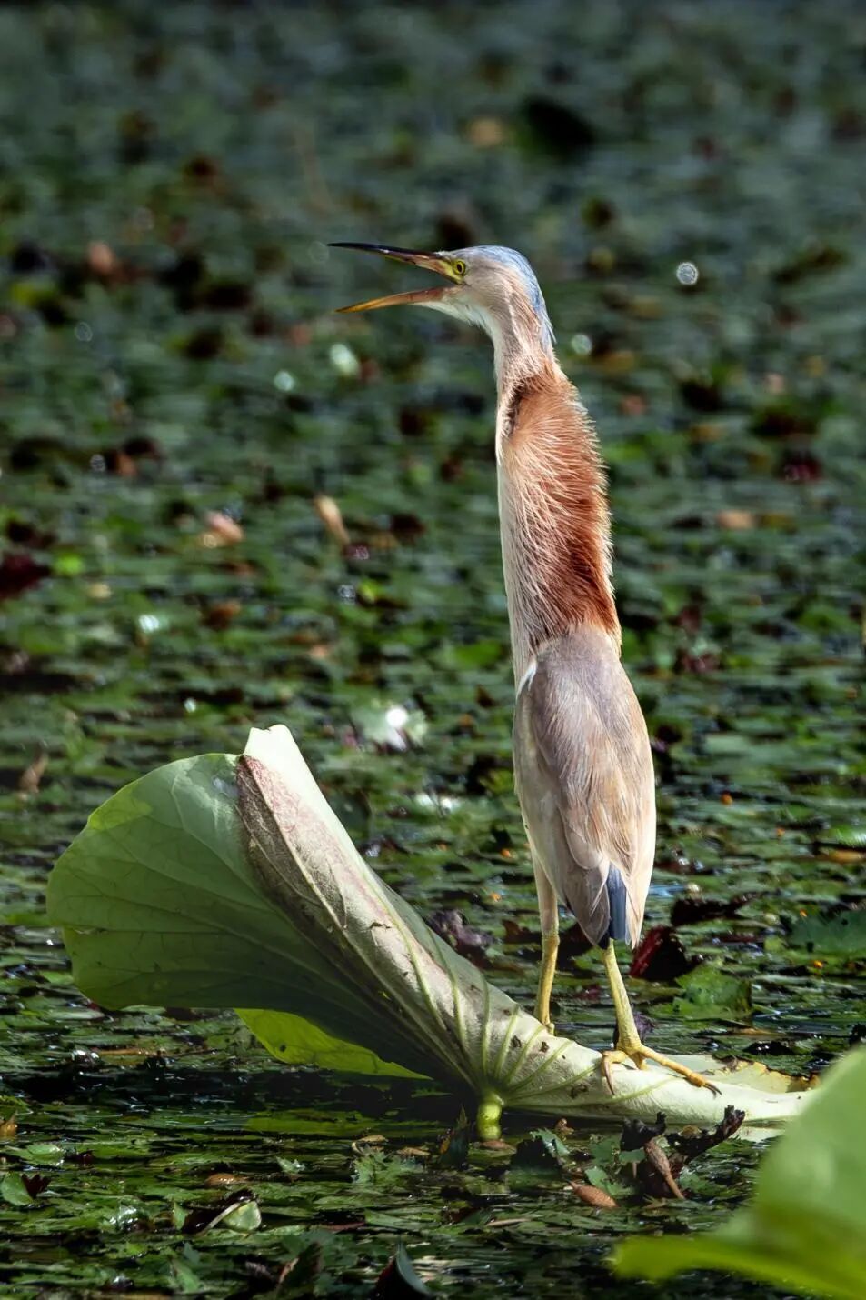 上海市浦东新区滴水湖的黄苇鳽。丁玉弟/摄(投稿作品“引吭高歌”)