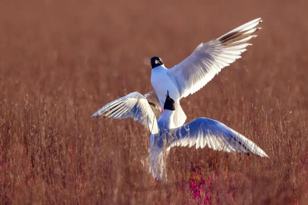 盐城黄海湿地候鸟来了、盐蒿红了。武建春/摄(投稿作品“打斗”)