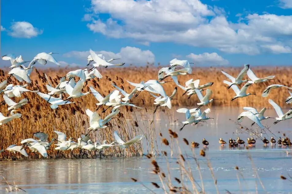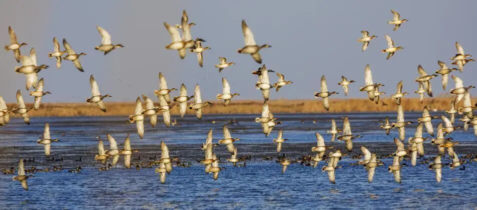 江苏盐城国家级珍禽自然保护区,一群野鸭在水面上空振翅翱翔。潘振群/摄(投稿作品“湿地飞羽”)