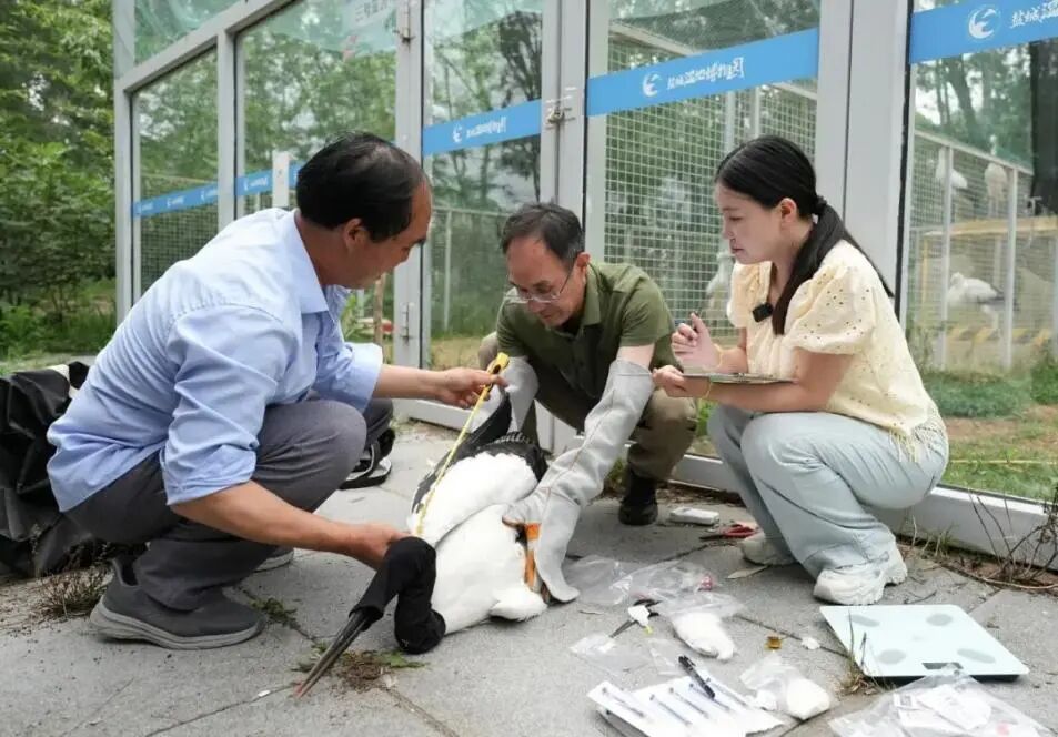 盐城建湖九龙口湿地博物园野生鸟类救护站,工作人员为东方白鹳安装身份环志及定位装置。周晨阳/摄