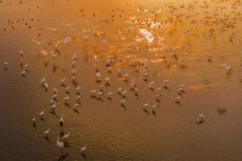 盐城东台条子泥湿地,群鸟与波光共舞。潘振群/摄(投稿作品“灿灿晨阳百鸟欢”)
