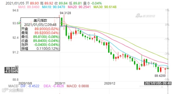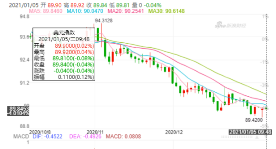 与此同时,美元指数跌破89.5,续刷2018年4月以来新低,截止5日发稿,美元指数报89.84,最低报89.81。此前在12月17日,美元指数失守90关口。