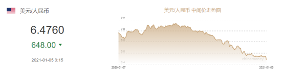 1月5日,人民币对美元中间价调升648个基点,报6.4760,上一交易日中间价6.5408。