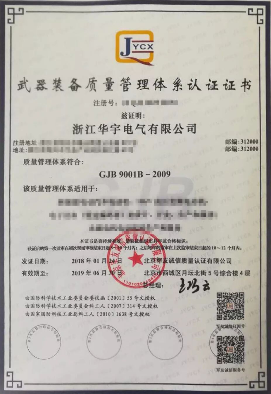 2018年1月31日,浙江华宇电气有限公司正式收到 “武器装备质量管理体系认证证书”,这标志着该公司从“军工双证”升级为“军工三证”,成为为数不多的拥有完整军工资质的民营企业,提升了打入军品市场的核心竞争力,同时也标志着浙江长三角军民融合产业园军工创新特色服务迈出了扎实的一步。