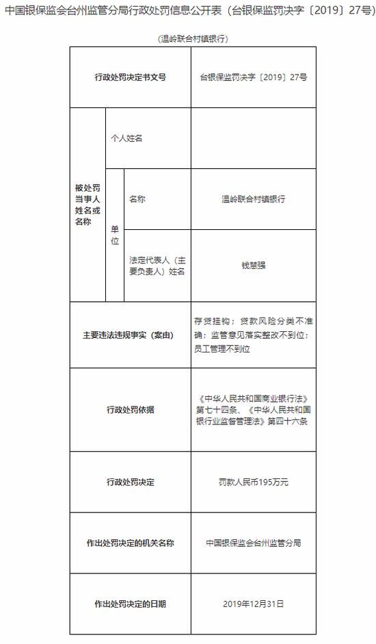 1月8日,银保监会官网公布的信息显示,浙江温岭联合村镇银行因涉及存贷挂钩;贷款风险分类不准确;监管意见落实整改不到位;员工管理不到位四项违法违规行为,被处罚款195万元。9月,温岭联合村镇银行再次被罚35万,被罚缘由为信贷管理不审慎形成风险。