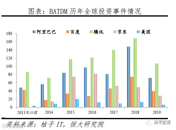 宏观经济承压、优秀标的减少,2019年各大互联网巨头投资行为均有所收紧。2019年阿里巴巴及相关企业共进行71件全球投资行为,较上期下降52%;百度及相关企业共进行39件投资行为,较上期下降47.3%;腾讯及相关企业共进行107件投资行为,较上期下降36.3%;京东及相关企业共进行28件投资行为,较上期下降42.9%;美团及相关企业共进行6件投资行为,较上期下降53.8%。