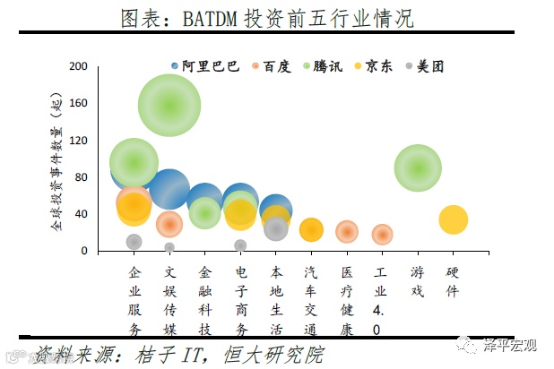 互联网巨头企业成为中国独角兽诞生的重要推手,企业服务领域是巨头目前关注重点。在当前互联网生态化的趋势下,独角兽企业已经成为巨头生态的重要构成。通过自孵化或战略投资等方式,众多巨头企业开始搭建生态系统,并逐渐完善。从榜单中可以看出,大约50%的企业或多或少与阿里巴巴、百度、腾讯、京东、美团等相关联。其中,企业估值越高,巨头对其影响力更强。从估值前十企业来看,与巨头关联程度高达100%。从投资策略来看,阿里巴巴、百度、腾讯、京东、美团是基于各自主营业务和重点布局领域而展开,例如电子商务之于阿里巴巴,搜索和广告之于百度,游戏之于腾讯等。但企业理念影响各自对待被投企业的方式,出于对阿里系生态整体战略的严格控制要求,阿里巴巴26.4%投资事件为战略投资,百度、腾讯、京东、美团投资事件基本集中早期的天使轮和A轮。从投资行业来看,各大互联网企业均加强对包括大数据、云计算等在内的企业服务行业投资力度,企业服务行业是阿里巴巴、百度、京东所投数量最多的领域,分别占各自投资总事件的14%、17.7%、14.2%,是腾讯、美团所投第二多领域,分别占各自投资总事件的11%、12.2%。