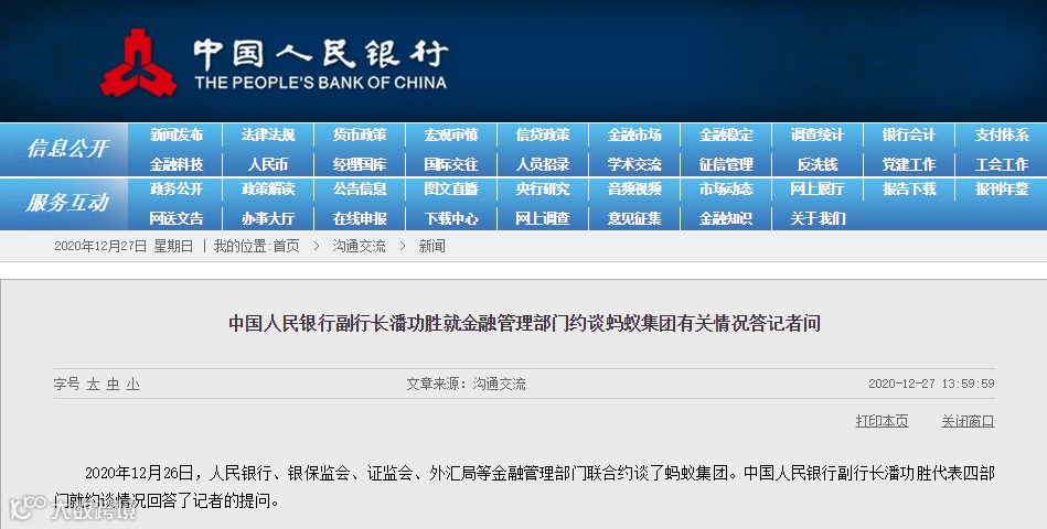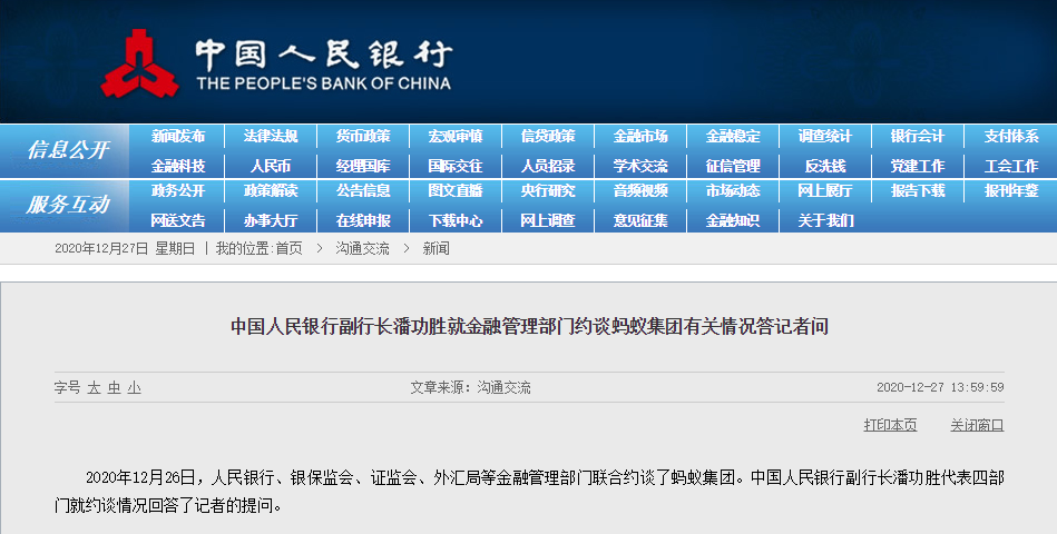 2020年12月26日,人民银行、银保监会、证监会、外汇局等金融管理部门联合约谈了蚂蚁集团。中国人民银行副行长潘功胜代表四部门就约谈情况回答了记者的提问。
