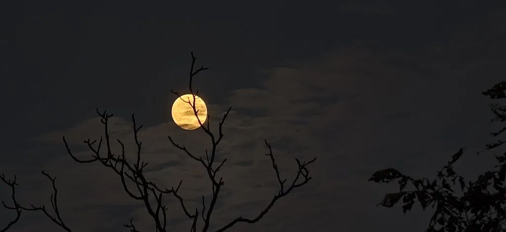 看!这轮中秋明月,并非“小时不识月,呼作白玉盘”的稚气,而是一轮饱满、圆润,带着些许蜜糖般暖黄色的大月亮。