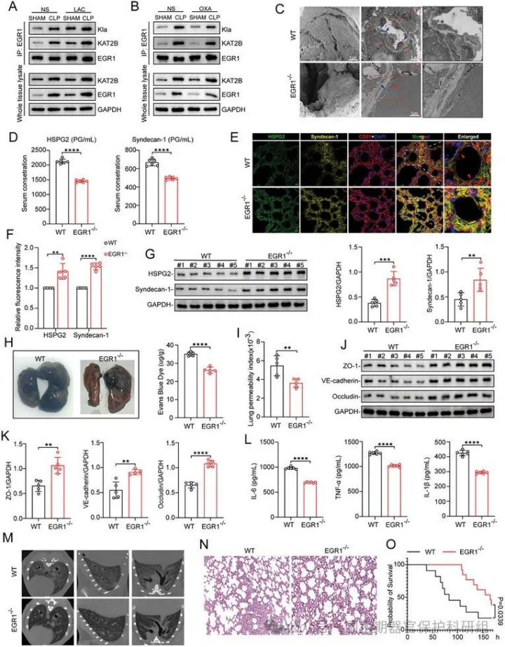 为阐明EGR1是否参与体内肺血管内皮表面糖萼的降解,我们首先评估了CLP后肺组织中EGR1的表达及乳酸化水平。与假手术组(Sham)相比,CLP显著促进EGR1表达及乳酸化。此外,补充乳酸可增强EGR1表达及其与KAT2B的相互作用;而OXA预处理则抑制CLP诱导的EGR1表达及其与KAT2B的结合,从而降低EGR1乳酸化水平。为探究敲除EGR1能否减轻脓毒症诱导的糖萼降解和急性肺损伤(ALI),我们通过CLP手术构建EGR1敲除(EGR1−/−)和野生型(WT)小鼠多微生物性脓毒症模型,并于术后24小时采集肺组织和血液样本。EGR1敲除未影响肺组织或血清乳酸水平。与WT小鼠相比,EGR1−/−小鼠肺微血管糖萼降解程度较轻,内皮间隙更小;血清中糖萼脱落产物(如硫酸乙酰肝素、透明质酸)水平更低。免疫荧光及WB结果显示,EGR1沉默可缓解脓毒症诱导的肺组织HSPG2和syndecan-1水平下降。