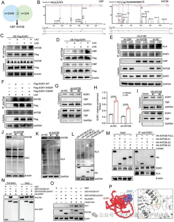 1. 双重调控模式的发现:研究证实乳酸不仅通过组蛋白H3K18la激活转录因子EGR1的表达,还通过新型乳酸化转移酶KAT2B催化EGR1蛋白K364位点乳酸化(EGR1 K364la),形成“代谢-表观遗传-功能蛋白修饰”的级联调控。这一模式突破了传统认知中乳酸仅作为能量代谢产物的局限,首次建立代谢产物通过双重修饰驱动疾病进程的新机制。