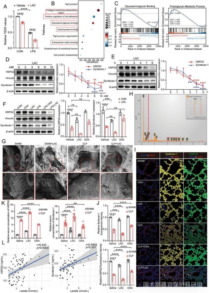 通过转录组测序及KEGG通路分析,发现差异表达基因主要富集于细胞间紧密连接、细胞外基质(ECM)及糖萼调控通路。基因集富集分析(GSEA)进一步显示差异基因与糖胺聚糖结合及蛋白聚糖代谢显著相关。体外实验证实,乳酸以剂量和时间依赖性方式显著降低糖萼主要成分HSPG2和Syndecan-1的蛋白表达;且乳酸可加剧LPS诱导的糖萼降解,而OXA预处理可逆转该效应,免疫荧光(IF)染色结果一致。采用鱼藤酮(Rotenone)阻断氧化磷酸化或siRNA敲低LDHA后,LPS诱导的糖萼降解效应部分减弱,提示内源性与外源性乳酸共同参与糖萼降解。