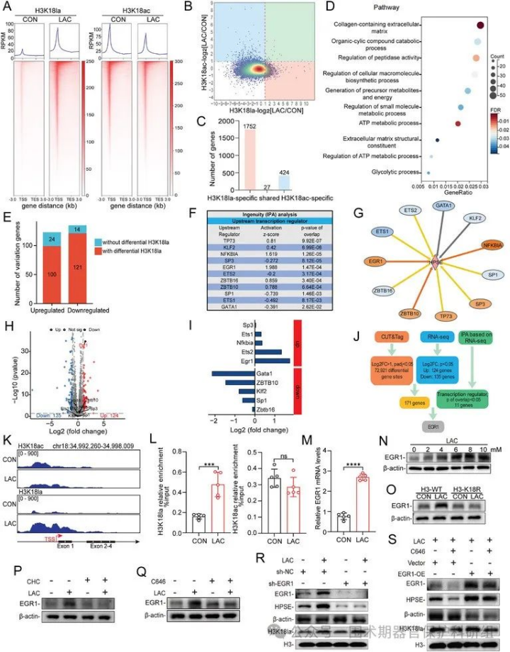 图5.H3K18乳酸化修饰通过激活EGR1上调HPSE表达