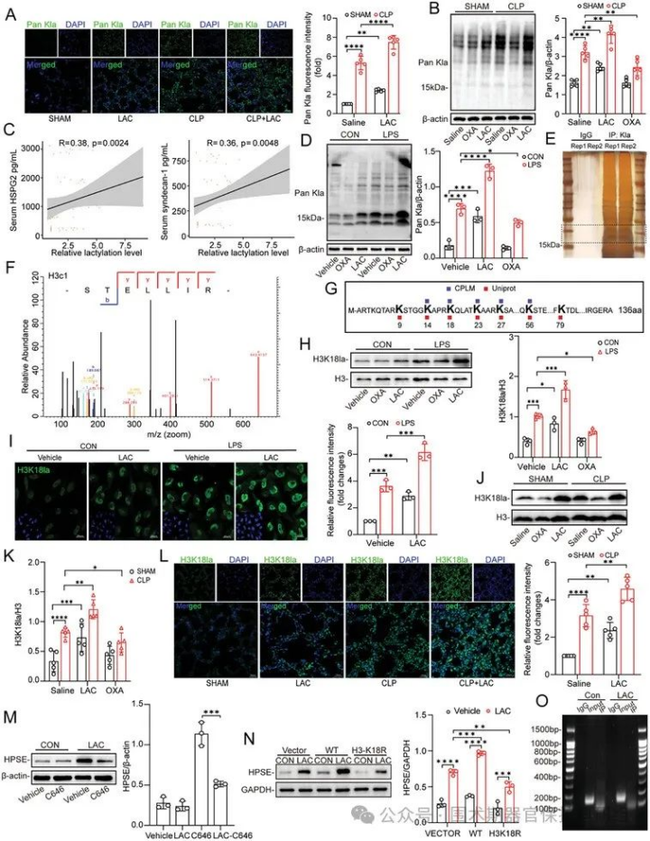 图4.脓毒症期间整体乳酸化修饰与H3K18乳酸化水平升高