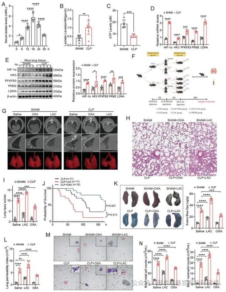 为探究乳酸是否加剧脓毒症期间急性肺损伤(ALI),采用经典盲肠结扎穿孔术(CLP)构建C57BL/6小鼠脓毒症模型。血清乳酸浓度在CLP后18小时达峰后逐渐下降。在血清乳酸峰值时间点检测肺组织代谢指标,发现CLP组较假手术组肺组织乳酸水平显著升高,ATP含量显著降低。已有研究证实脓毒症时有氧糖酵解(Warburg效应)增强,与免疫失调及器官功能障碍密切相关。本研究发现,脓毒症相关ALI(S-ALI)小鼠肺组织中HIF1α、HK3、PFKFB3、PKM2及LDHA的mRNA和蛋白表达均显著上调。为验证乳酸的病理作用,实验设计六组干预方案:建模前3小时腹腔注射OXA(0.75g/kg)抑制糖酵解,建模后6小时补充乳酸(0.5g/kg)。影像学及病理分析显示:外源性乳酸加剧脓毒症小鼠肺损伤,而OXA显著减轻病理改变。值得注意的是,假手术组注射乳酸后亦出现一定程度肺损伤。生存分析显示:与生理盐水组相比,乳酸干预使脓毒症小鼠7天存活率下降23.53%,OXA预处理则提高存活率18.1%。