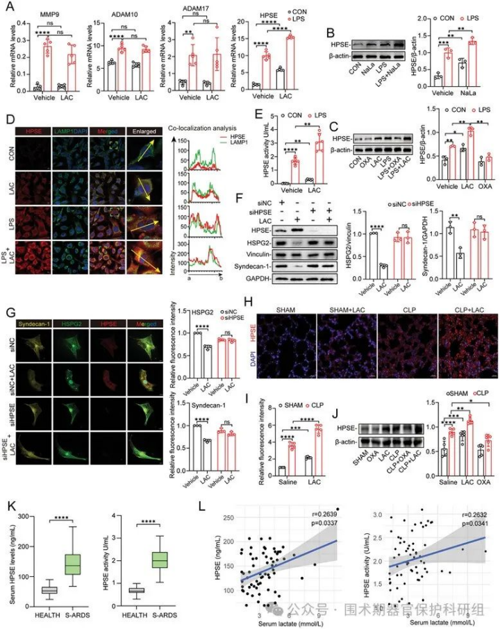 在体内实验中,小鼠肺组织切片免疫荧光染色显示,多微生物脓毒症可显著升高肺组织HPSE水平,而外源性乳酸输注进一步强化该效应。组织裂解液蛋白质印迹分析亦呈现相同趋势。与之相反,OXA介导的乳酸生成抑制可显著减弱CLP诱导的肺组织HPSE表达上调。值得注意的是,即使在假手术组中,单独乳酸刺激亦可诱导肺组织HPSE表达增加。