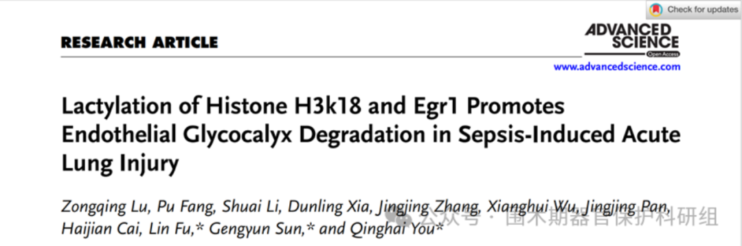 Lu Z, Fang P, Li S, et al. Lactylation of Histone H3k18 and Egr1 Promotes Endothelial Glycocalyx Degradation in Sepsis-Induced Acute Lung Injury. Adv Sci (Weinh). 2025;12(7):e2407064. doi:10.1002/advs.202407064