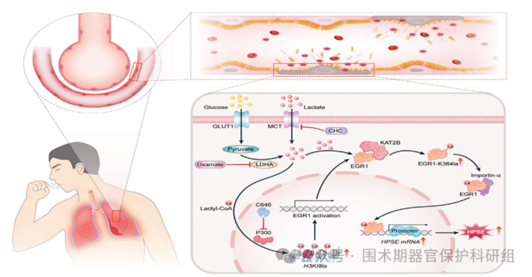 根据2021年拯救脓毒症运动(SSC)指南,脓毒症被定义为宿主对感染的失调免疫反应引发的致死性器官功能障碍,在ICU患者中具有高病死率。急性呼吸窘迫综合征(ARDS)是脓毒症最常见且严重的并发症,其亚型脓毒症诱导ARDS(S-ARDS)以微循环功能障碍和内皮通透性增高为显著病理特征,因此靶向微血管内皮功能保护成为S-ARDS治疗的核心策略。血管内皮糖萼作为覆盖内皮腔面的凝胶状多糖-蛋白复合物,其主要成分蛋白聚糖在脓毒症相关急性肺损伤(S-ALI)中发挥关键屏障作用。本研究首次揭示乳酸通过"乳酸-KAT2B(赖氨酸乙酰转移酶2B)-组蛋白H3K18乳酸化(Lactylation)-EGR1(早期生长反应因子1)/HPSE(乙酰肝素酶)轴"调控内皮糖萼降解的全新病理通路,其结果发表于2025年的《Advanced Science》杂志。