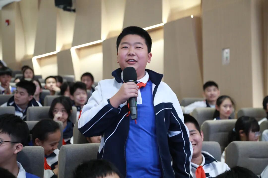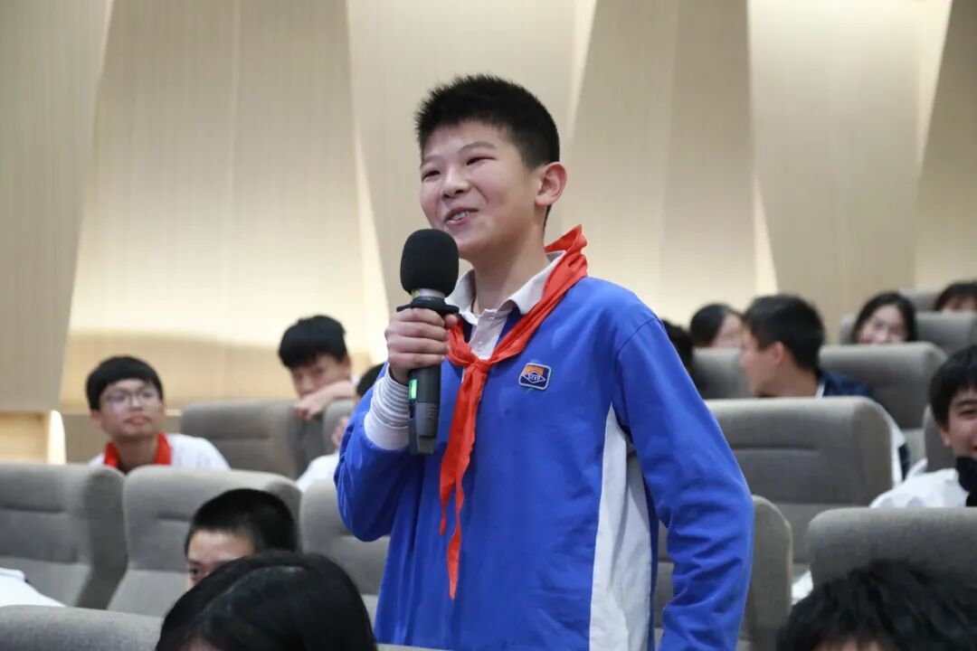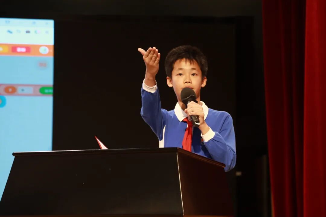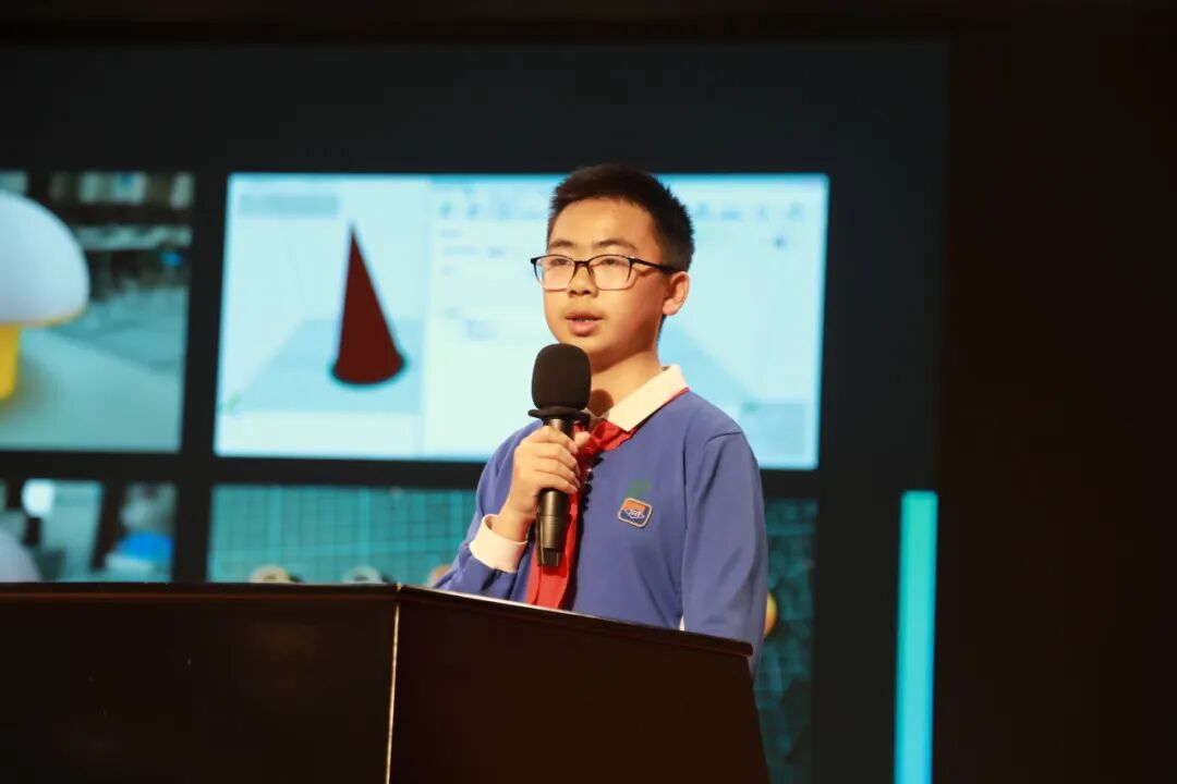 三位热爱发明创造的同学登上舞台,分享他们与发明的故事。七(7)班唐浩涵同学讲述在《从地球到火星之太空遇难》中经历了多次目标调整和技术攻关,但团队分工合作、不畏困难,最终克服了技术难题,展现了团队智慧的重要性。