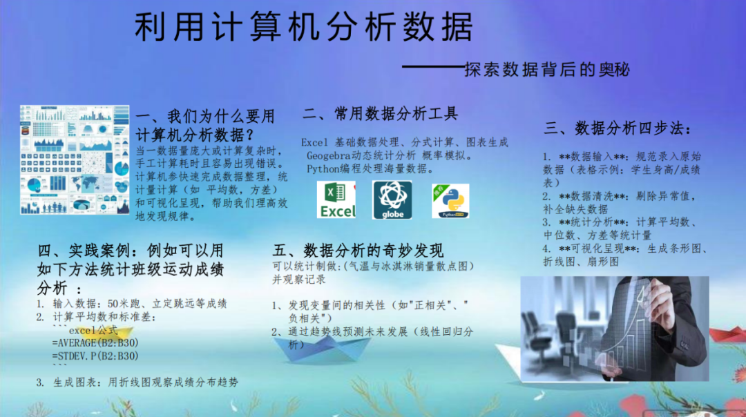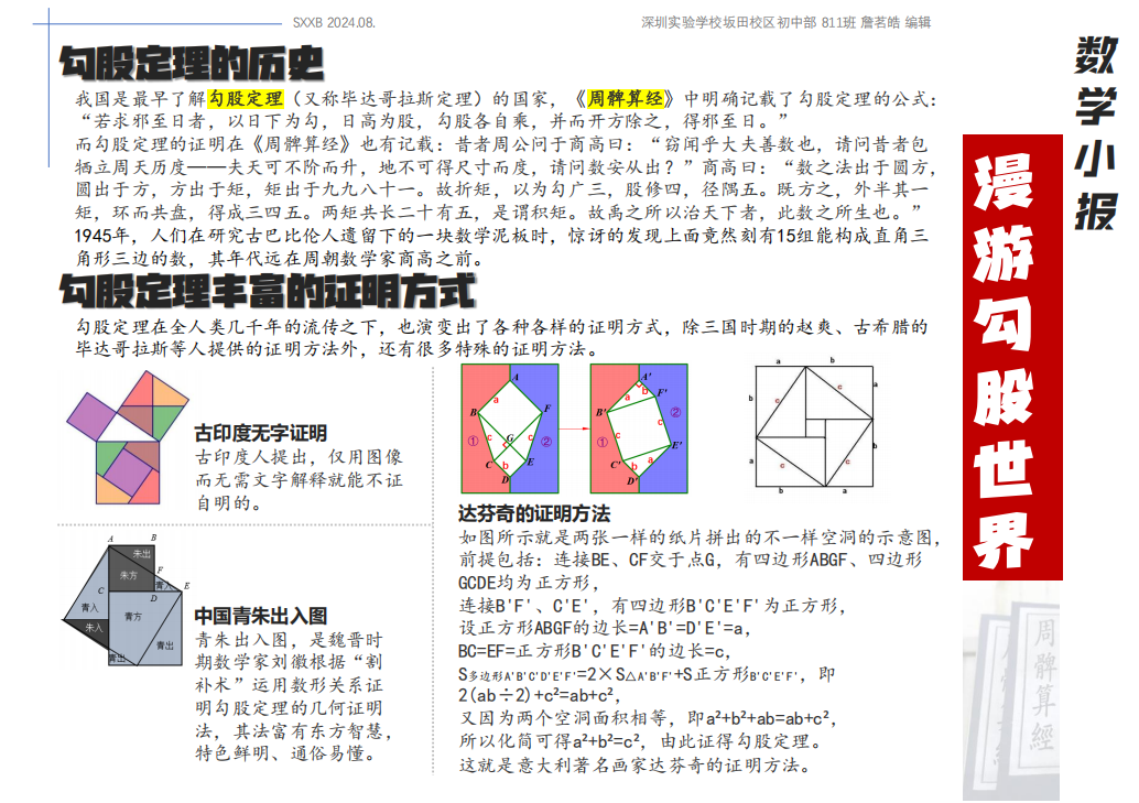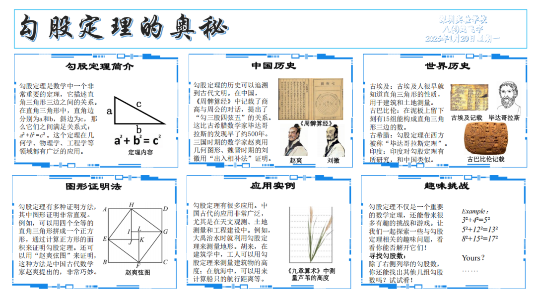 如果说七年级的数学家故事电子报是点状的闪耀,那么八年级的数学史和数学应用电子报则是一条璀璨的银河,引领我们穿越时空,追溯数学发展的轨迹。从勾股定理的多种证法到古希腊希帕索斯引发的数学危机;从一次函数的发展演变到近代微积分、概率论的兴起……八年级的同学们,用他们的电子报,为我们勾勒出一幅幅数学发展的壮丽画卷。在这些电子报中,我们见证了数学如何从最初的实用工具,逐步发展成为一门严谨的科学体系,又如何深刻地影响着人类文明的进程。