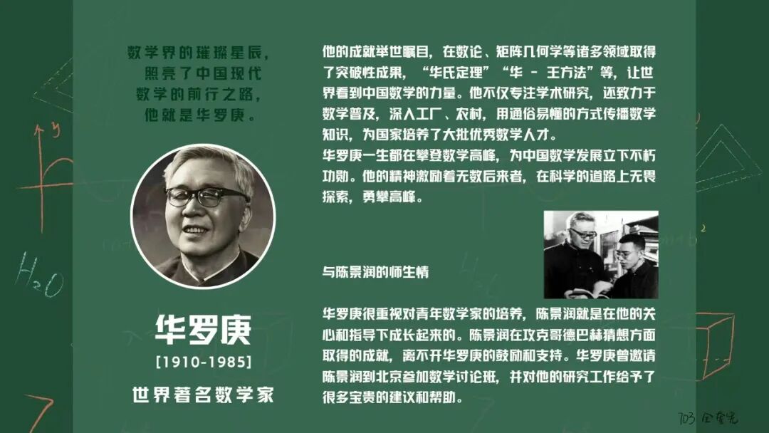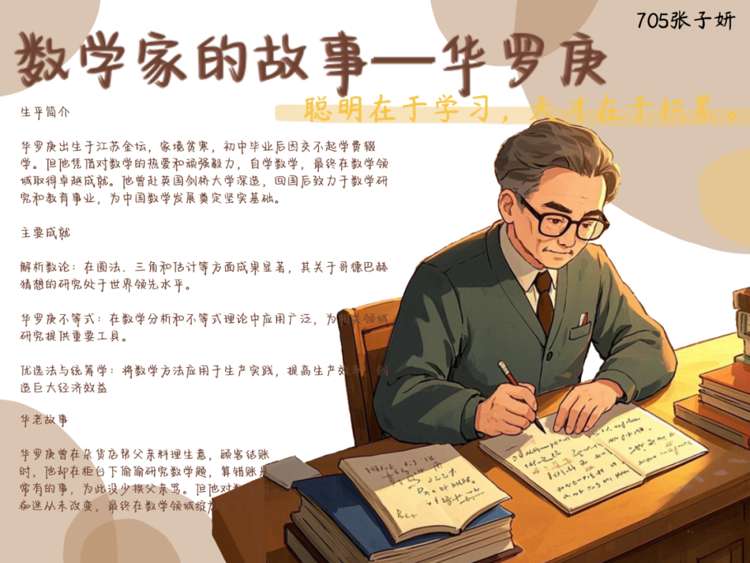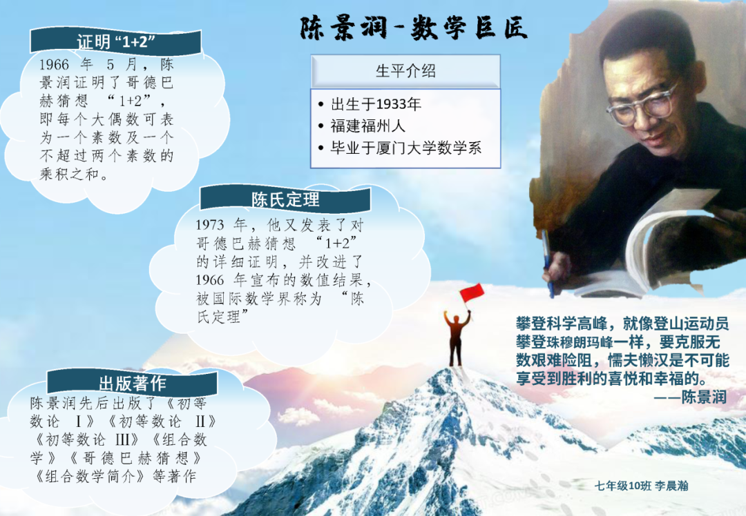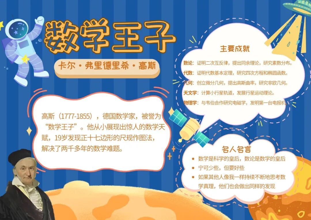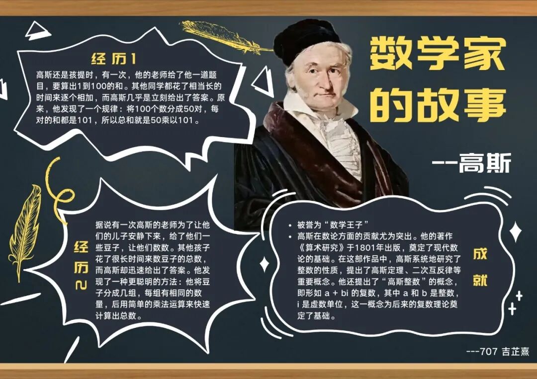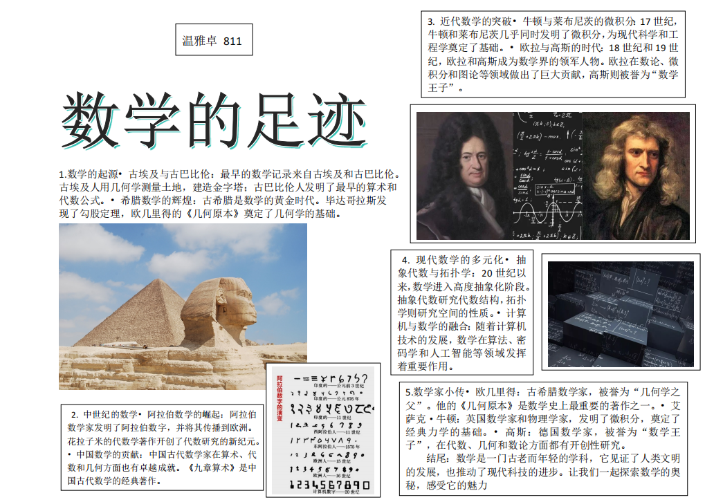 七年级的同学们,用一双双好奇的眼睛,探寻着数学史上的璀璨星辰。将那些伟大数学家的生平事迹、学术贡献以及不为人知的趣事,以图文并茂的形式生动展现。从欧几里得的《几何原本》到高斯的数学天赋,从华罗庚的“华氏定理”到陈景润攻克世界著名数学难题“哥德巴赫猜想”中的“1+2”,每一个故事都仿佛是一扇窗,让同学们窥见了数学世界的广阔与深邃。