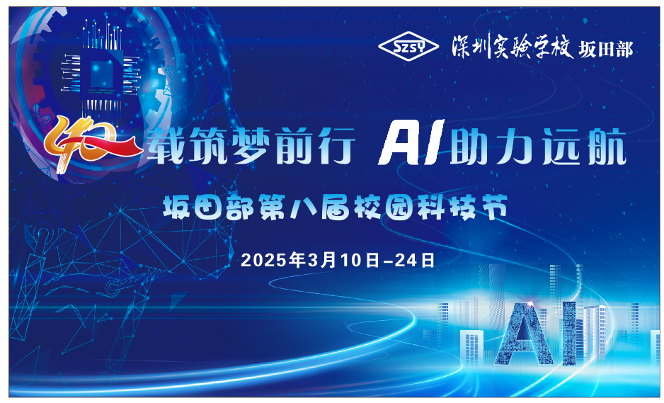 时光长河奔涌四十载,校园的每一寸土地都见证着知识的传承与梦想的萌芽。如今,AI浪潮汹涌而来,与我们一路筑梦的脚步激烈碰撞。深圳实验学校坂田部第八届校园科技节活动以“40载筑梦前行,AI助力远航”为主题于3月10日-24日如期举行,一场传统与创新交融、智慧与科技共舞的盛宴就此拉开帷幕,快跟着我们的脚步一同走进这场精彩非凡的科技狂欢。