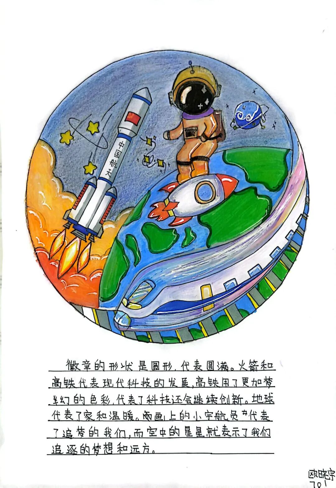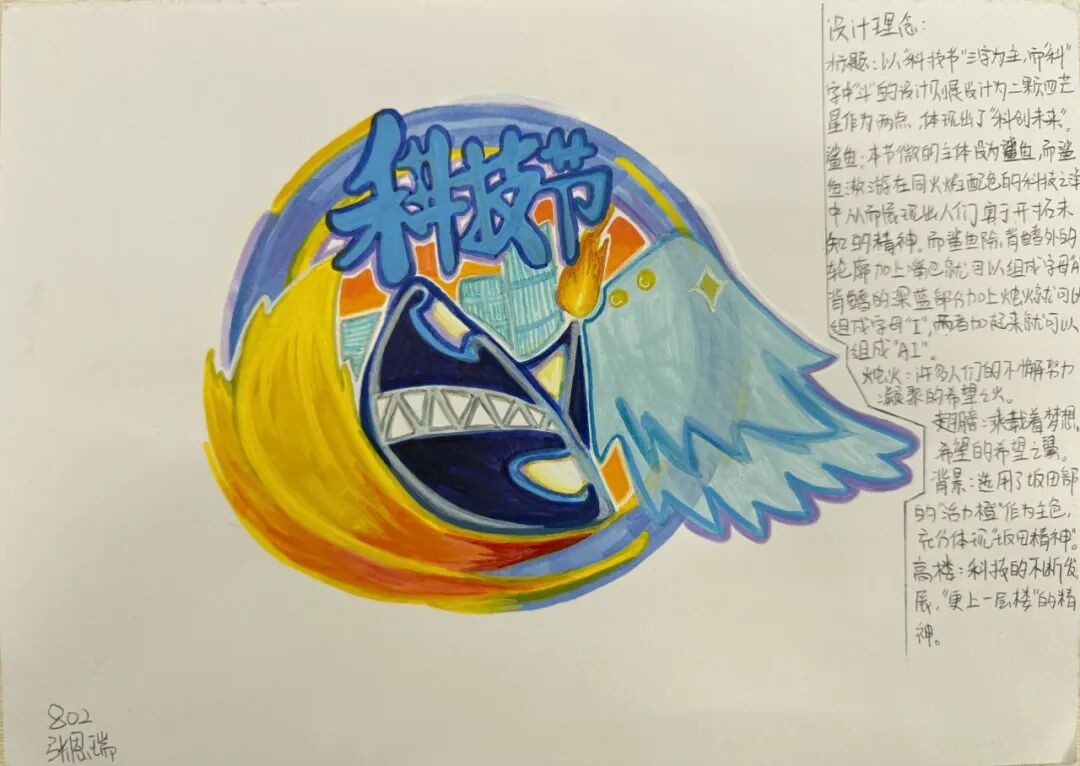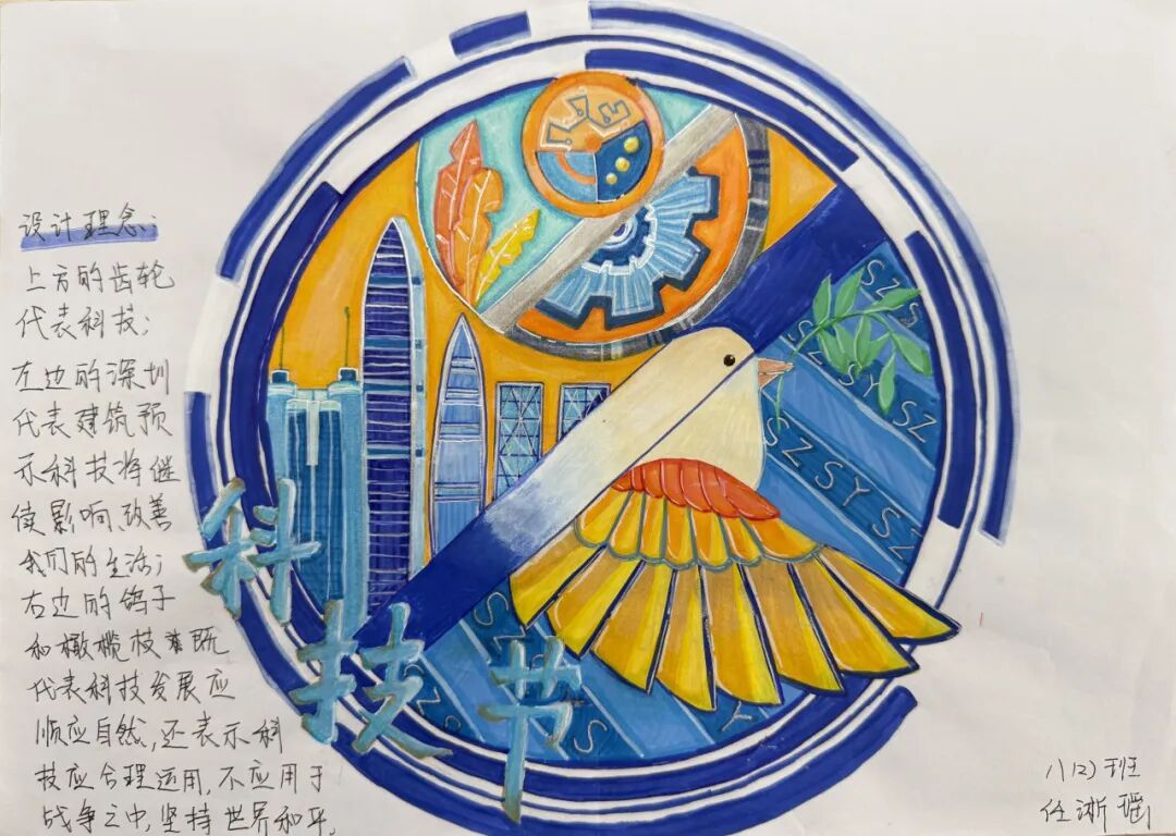 这些节徽可不简单,每一个都是学生创意与创新思维的结晶。从最初的灵感闪现,到草图上的勾勾画画,学生们一路探索,一路创造。有的同学从浩瀚宇宙获取灵感,将神秘的星球、闪耀的银河融入节徽,有的同学着眼于生活中的科技元素,把智能机器人、高速列车等画进设计,还有的同学大胆运用色彩,鲜明的对比色碰撞出科技的活力。