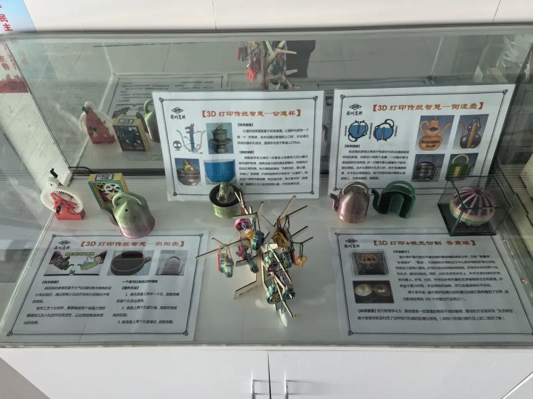 3D星火创客社的同学使用3D打印技术制作了多种创意作品:公德杯,设计独特,寓意倡导文明公德;倒流壶,利用物理原理实现水从底部倒流的神奇效果;阴阳壶,巧妙结合传统文化与现代科技,展现阴阳平衡的理念;香薰球,造型精美,兼具实用与美观,适合日常使用。这些作品不仅展示了3D打印技术的多样性,也体现了科技与传统文化的融合创新。
