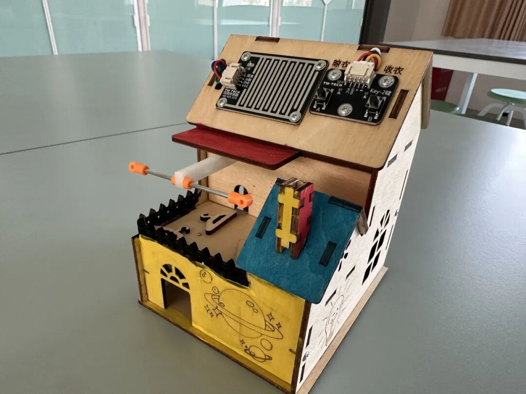 科创社的同学使用激光切割和传感器制作了智能家居模型。这个小屋集成了多种功能:当温度升高时,内置的小风扇会自动启动以降温;还设计了手动控制的灯光开关,以模拟真实的家居环境。此外,还有智能农场模型,通过传感器和自动化系统,完成了土壤湿度监测、自动浇水以及光照调节等功能,展现了现代农业科技的魅力。这些作品体现了同学们对智能技术的深入探索与创新实践。