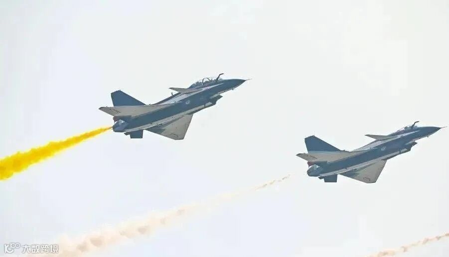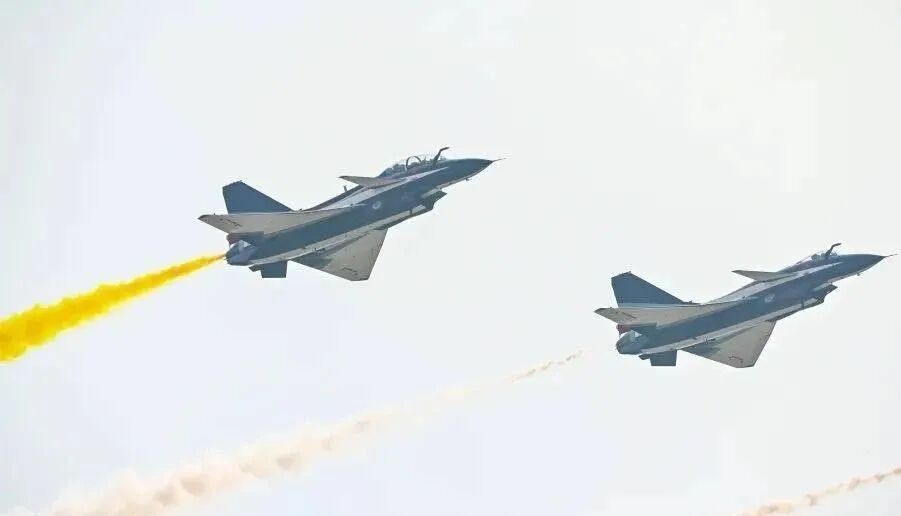 9月28日,广东省珠海市,教—10飞机在珠海国际航展中心上空飞过。当日,第十三届中国航展在珠海国际航展中心开幕。