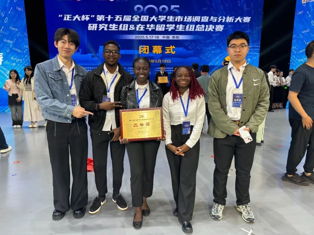 3.由Grace Agyekum(加纳)、Kwabena Amanor Anim-Boateng(加纳)、Agnes Nyamenaose Essuman(加纳)、黄禹博、么济琛组成的“金福智伴队”凭借其作品《探秘“老宝贝”的智能伙伴——石家庄市养老机器人消费市场以及消费者影响因素研究》获得在华留学生组国家二等奖。