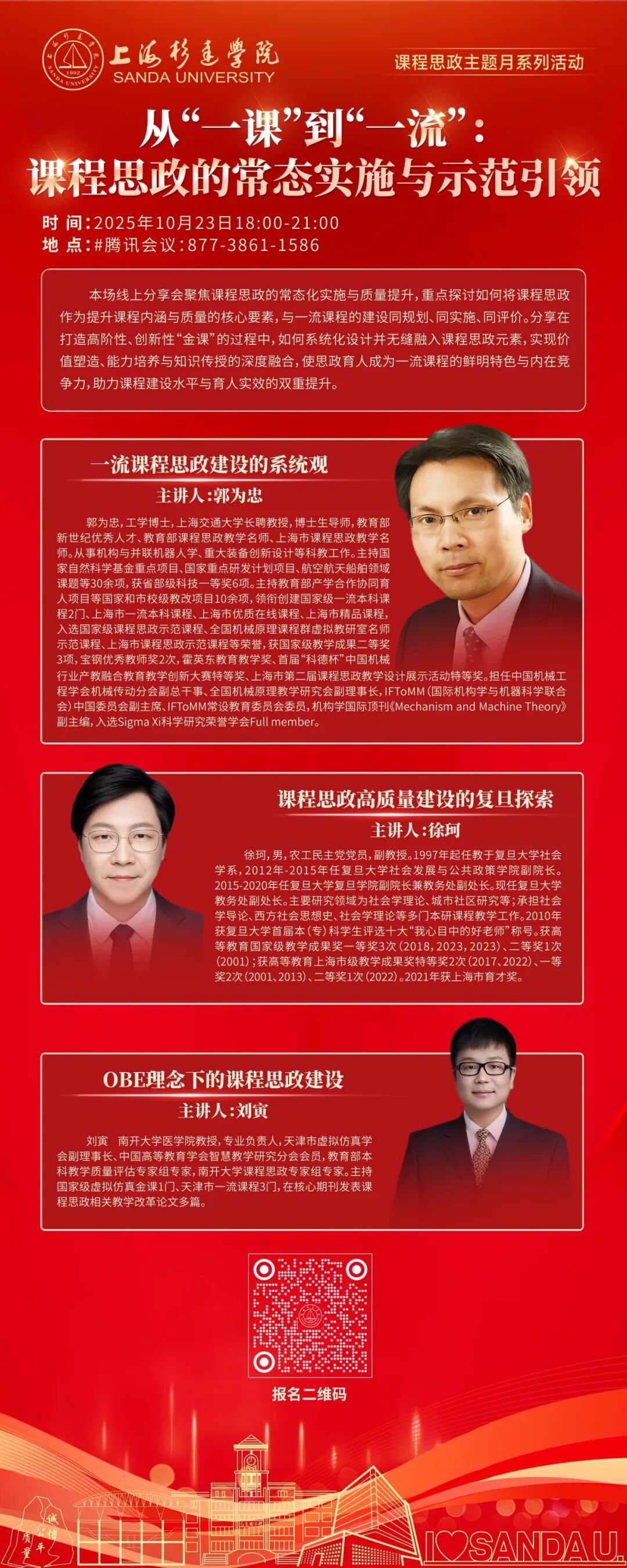 讲座内容:《一流课程思政建设的系统观》《课程思政高质量建设的复旦探索》《OBE理念下的课程思政建设》聚焦课程思政的常态化实施与质量提升,重点探讨如何将课程思政作为提升课程内涵与质量的核心要素,与一流课程的建设同规划、同实施、同评价。分享在打造高阶性、创新性“金课”的过程中,如何系统化设计并无缝融入课程思政元素,实现价值塑造、能力培养与知识传授的深度融合,使思政育人成为一流课程的鲜明特色与内在竞争力,助力课程建设水平与育人实效的双重提升。