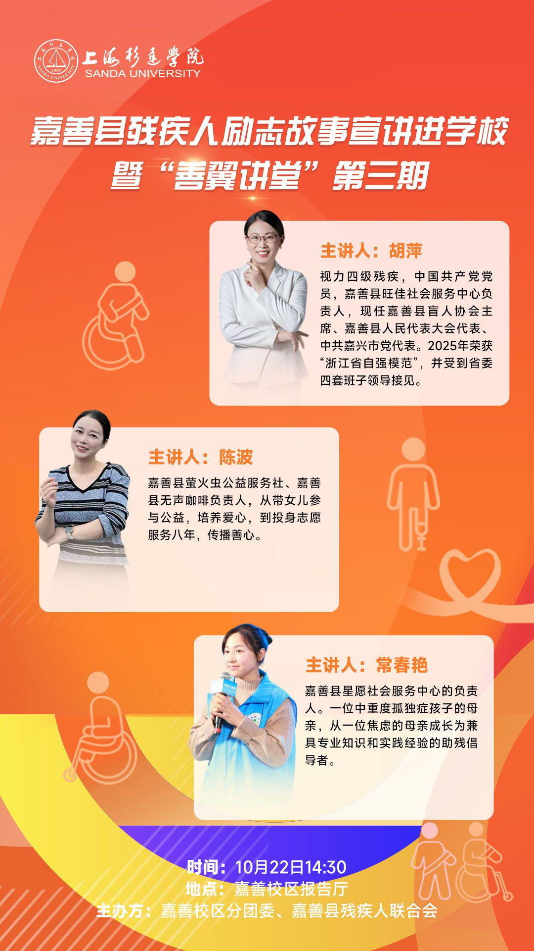主讲人简介:胡萍,视力四级残疾,中国共产党党员,嘉善县旺佳社会服务中心负责人,现任嘉善县盲人协会主席、嘉善县人民代表大会代表、中共嘉兴市党代表。2025年荣获“浙江省自强模范”,并受到省委四套班子领导接见。