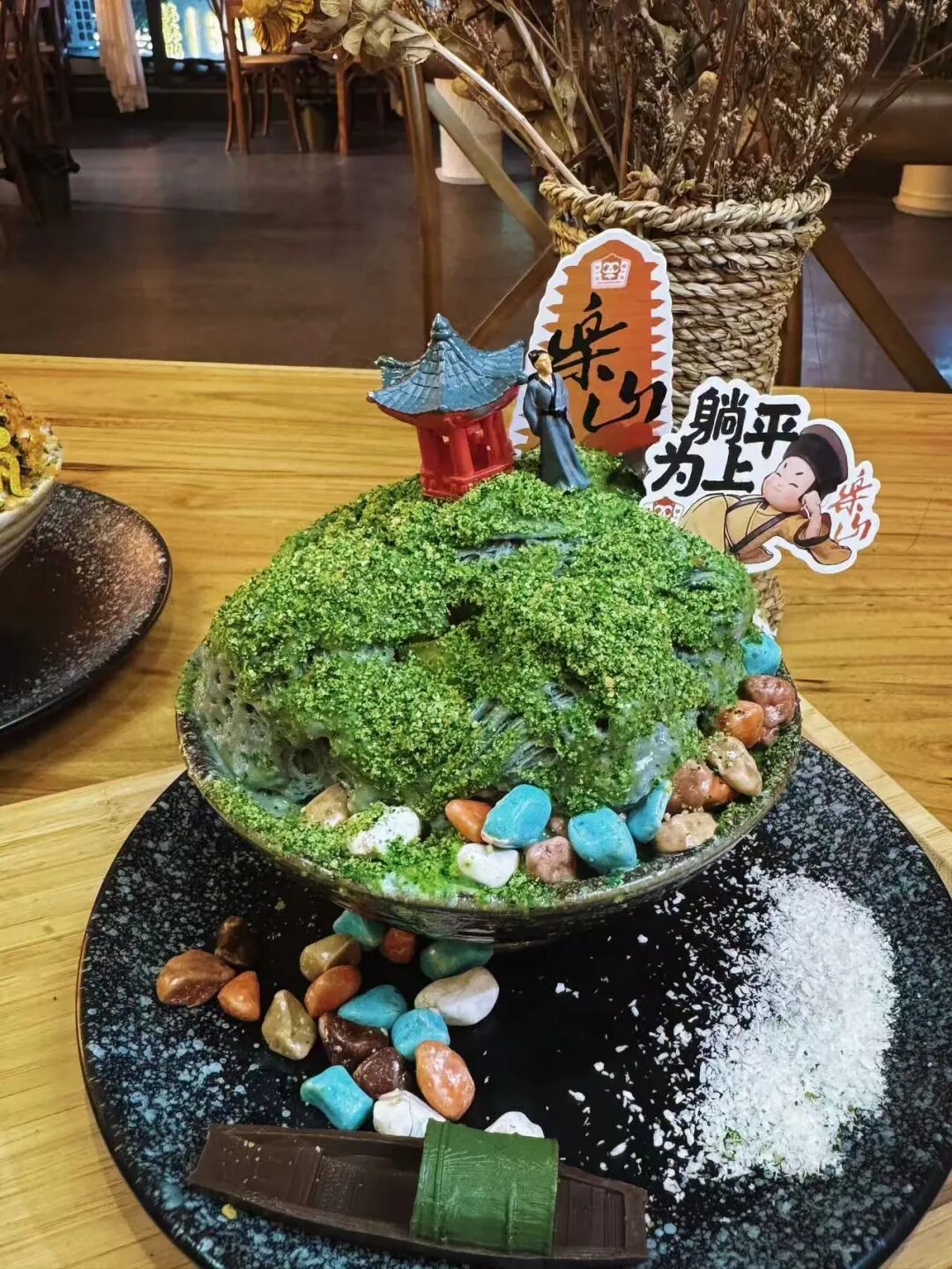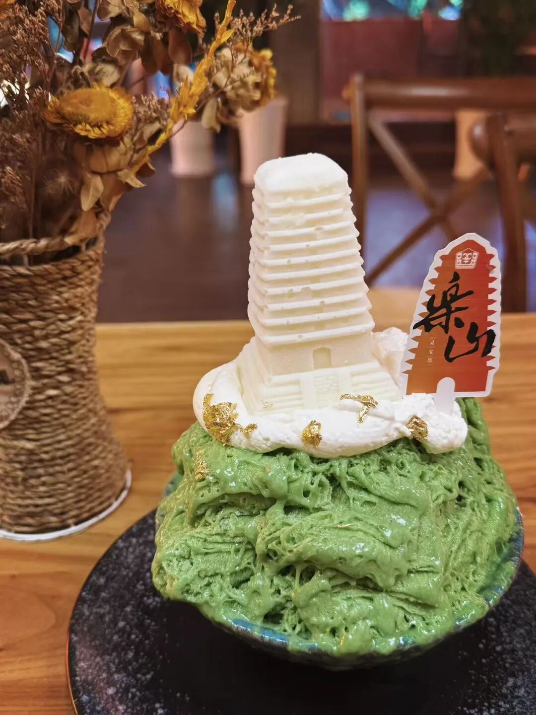 心灯之塔:乐山灵宝塔主题的绵绵冰,上面是一个灵宝塔造型的奶砖,下面是抹茶味的绵绵冰,抹茶味很浓郁,搭配奶砖,味道融合得刚刚好。