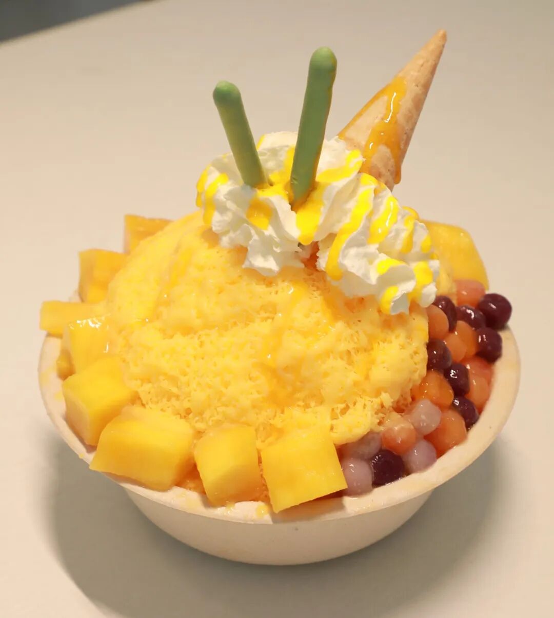 绵绵冰通常是水果的口味,芒果、榴莲味最多,叫人在品尝时,既能感受到细冰的凉爽,又能感受到水果的清香。