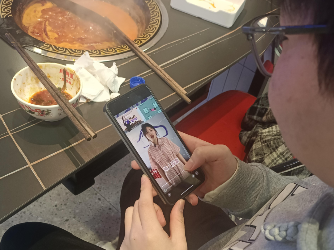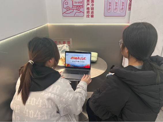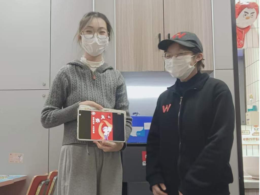 1月22日谷贝尔同学在和朋友吃饭时,借机与在吃饭的顾客宣传反邪教知识。邀请顾客观看反邪教顺口溜的短视频,以有节奏的顺口溜形式让顾客记忆深刻。
