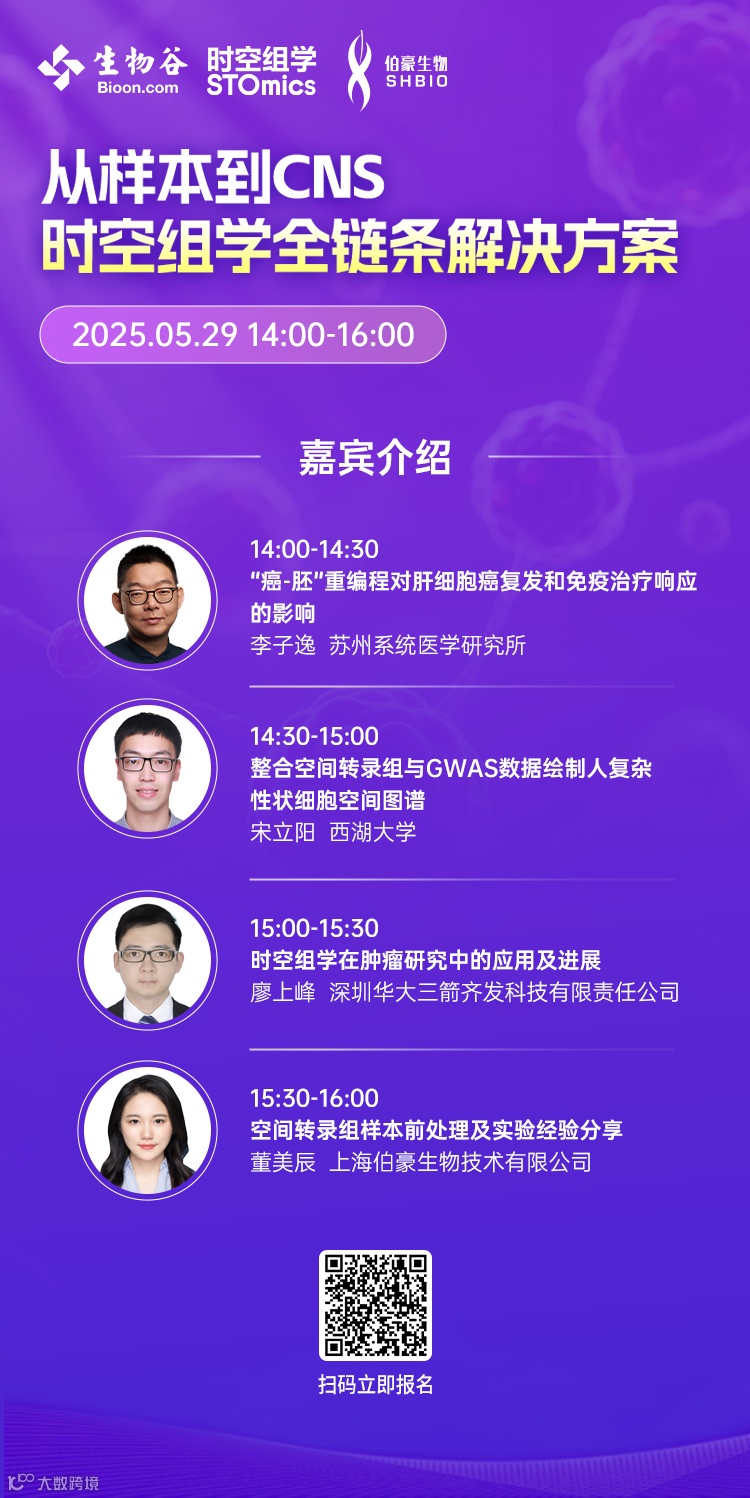 在生命科学领域,细胞与分子在时间和空间维度上的动态变化始终是探索生命奥秘的核心命题。华大时空组学凭借自主研发的Stereo-seq技术,推出两大革新性产品——时空转录组FF V1.3与时空转录组FFPE,以“纳米级分辨率”和“厘米级全景视场”为核心优势,为科研人员提供从样本到数据的全链条解决方案,推动生命奥秘的深度解析。5月29日14:00,华大时空组学将联合伯豪生物、生物谷,共同发起主题为“从样本到CNS,时空组学全链条解决方案 ”的空中讲坛,聚焦时空组学全链条解决方案前沿应用,相信可以为同行专家学者深入探索提供新思路。
