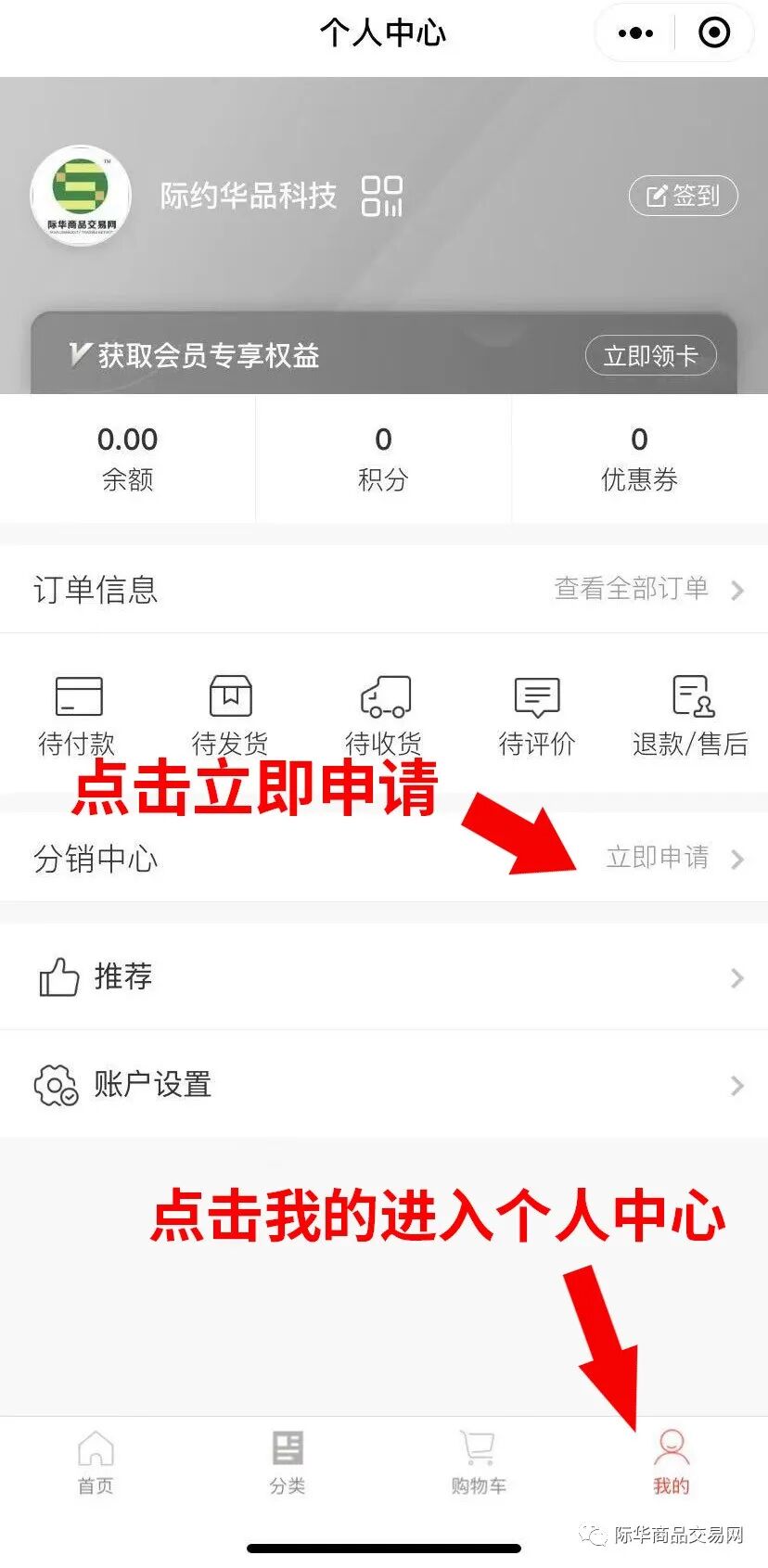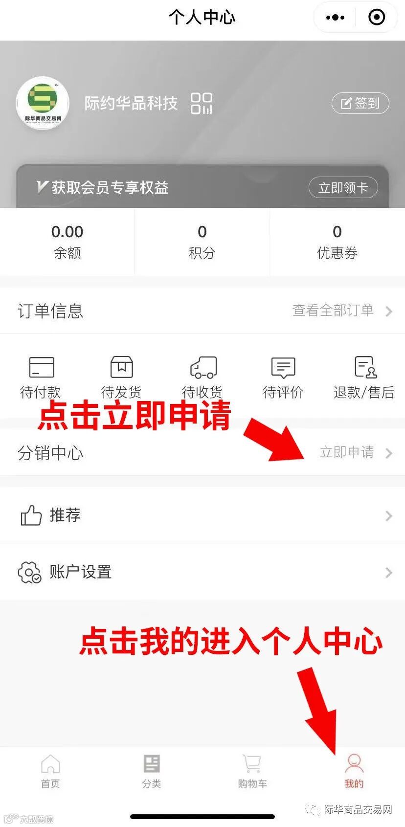 进入商城主页,点击我的进入个人中心,点击“分销中心”中的申请按钮。