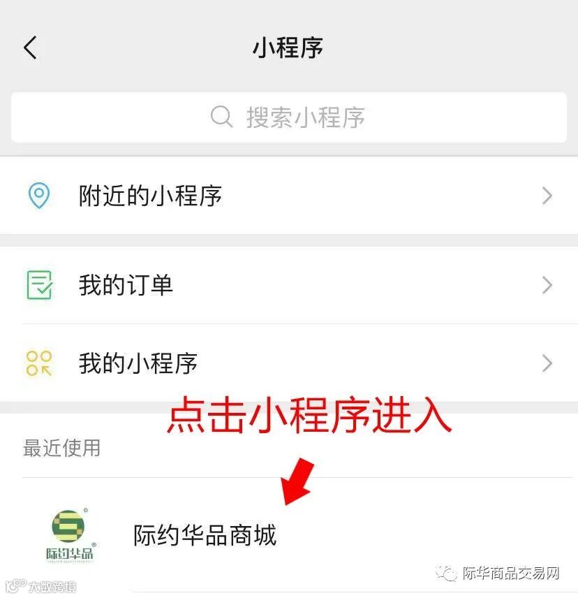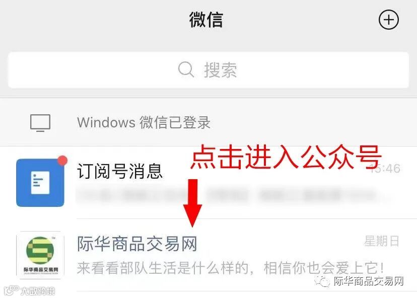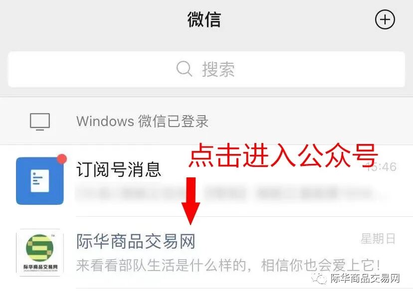 进入微信首页,点击“际化商品交易网”公众号